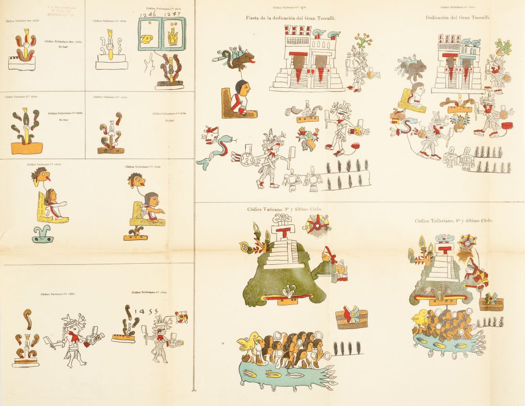 A - Fernández del Castillo, Francisco / Beyer, Hermann / Maler, Teobert / Áviles Solares, José. Memoria Leída en la Sociedad Mexicana de Geografía y Estadística. Concordancia entre los Calendarios Nahuatl y Romano / El Llamado "Calendario Azteca", Descripción e Interpretación del Cuauhxicalli de la "Casa de las Águilas" / Impresiones de Viaje a las Ruinas de Coba y Chichen-Itza / La Cronología de Ixtlilxóchitl / Los Sistemas Calendáricos del Anáhuac. a) Fernández del Castillo, Francisco. Memoria Leída en la Sociedad Mexicana de Geografía y Estadística. Concordancia entre los Calendarios Nahuatl y Romano. México: Imp. de Arturo García Cubas Sucesores Hermanos, 1907. 4o., 42 p. Con cuadro histórico-geroglifico de la Peregrinación de las Tribus Aztecas y Cuadro comparativo con pictogramas de los Códices Vaticano y Telleriano (ambos plegados y a color). Con sello de antiguo propietario en portada y láminas. Pastas gastadas y con manchas de humedad. Encuadernado en rústica. b) Bayer, Hermann. El Llamado "Calendario Azteca", Descripción e Interpretación del Cuauhxicalli de la "Casa de las Águilas". México: Verband Deutscher Reichsangfhöriger, 1921. 4o., VII + 126 p + 2 h. Con ilustraciones intercaladas en texto. Pastas y lomo gastados, de pág. 117 a 124 desprendidas. Encuadernado en pasta dura. c) Maler, Teoberto. Impresiones de Viaje a las Ruinas de Coba y Chichen-Itza. Mérida, Yucatán: José E. Rosado E., Editor, 1932 8o. marquilla, V + 74 p. Edición limitada a 500 ejemplares numerados, ejemplar Núm.183. Con prólogo de Santiago Burgos Brito y dos retratos del autor. Pasta posterior no es original, pasta anterior gastada, lomo con pequeñas roturas. Encuadernado en rústica. d) Áviles Solares, José. La Cronología de Ixtlilxóchitl. México: Taller Autográfico de la Secretaría de la Defensa Nacional, 1939. 8o. marquilla, 2 h. + 44 p. + 2 h. Con 6 láminas de página entera. Pastas con faltantes y manchas de humedad. Encuadernado en rústica. e) Áviles Solares, José. Los Sistemas Calendáricos del Anáhuac. México: Taller Autográfico de la Secretaría de la Defensa Nacional, 1939. 4o., VII + 117 p. Con 30 láminas e ilustraciones intercaladas en texto. Dedicatoria manuscrita del autor en portada. Pastas con pequeñas roturas, lomo deteriorado. Encuadernado en rústica. Total de piezas: 5. Estimado $6,000-8,000