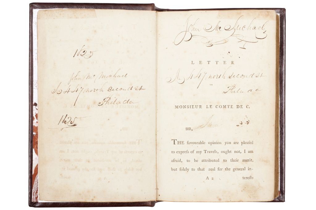 BB - Monsieur de Pagés (Pierre Marie François de Pagés). Travels Round the World, in the Years 1767, 1768, 1769, 1770, 1771. Dublin: P. Byrne - W. McKenzie - J. Moore, 1791. 8o. marquilla, XV + 437 p. Primera edición en inglés. Faltante en esquina derecha de la portada y de la última hoja. Algunas páginas con manchas de óxido. Notas de antiguo propietario en anteportada y paginas II y III. Encuadernado en pasta dura, en piel. Marie François de Pagés, oficial de la Marina Francesa en Santo Domingo, navega a Nuevo Orleans, viaja al río Mississippi para explorar el territorio de la Luisiana, toma una canoa y se dirige a Nacogdoches para posteriormente cruzar Texas en caballo, visitando incluso San Antonio. Llega a Laredo por el Río Grande y se adentra en México, pasando por Saltillo, Charcas, San Luis Potosí, San Miguel el Grande, San Juan del Río hasta llegar a la Ciudad de México, de la que proporciona una amplia descripción. Posteriormente por el Río Balsas llega a Chilpancingo y cruza a Acapulco. De este puerto se embarca a Guam y a las Filipinas, para regresar finalmente a Francia a través de la India, Medio Oriente y Malta. La narración de su viaje a Texas hecho en 1767 es de suma importancia por ser una de las primeras narraciones referentes a dicho territorio mexicano (Howes p. 13). El autor provee detalladas observaciones referentes a las tradiciones y costumbres de los nativos de Texas y demás indios del norte de México, así como de los misioneros. De especial interés es su narración de la conversión de los indios por los misioneros franciscanos: se describe como se captura al indio con lazos y se amarra como si fuera "un caballo salvaje", se lleva a la residencia del misionario quien, a través de persuasión, ayunos severos, casamientos o cualquier otro medio intenta civilizar al prisionero hasta poderlo bautizar. Los capítulos sobre su viaje en México incluyen importantes notas sobre las minas de oro y plata de Potosí, los indios, ciudades, costumbres, caminos, las clases sociales, etc. Estimado $ 12,000-14,000