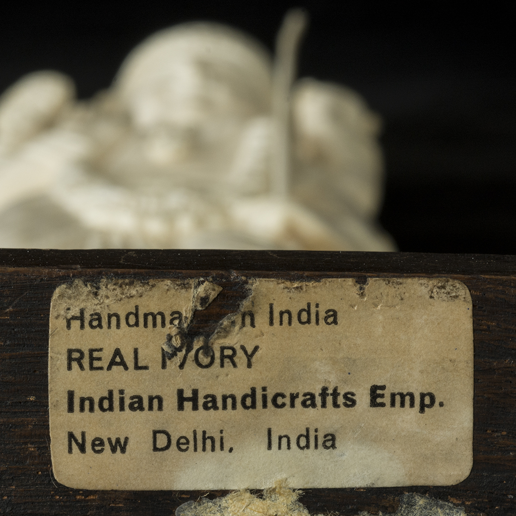 Vishnú. India. Siglo XX. Talla en marfil. Sobre base de madera. Presenta detalles de conservación, marcas y desgaste. Dimensiones: 42 cm. Vishnú es considerado el conservador del universo, así como el dios de la bondad y la preservación. Regula las fuerzas del bien y el mal y guía a los hombres hacia la salvación. Los principales atributos que podemos observar en esta figura en particular son el súdarshan chakra, anillo giratorio que se utiliza para degollar a los demonios y un shankhá, caracola cuyo sonido representa la victoria frente al enemigo. Estimado $ 7,000-9,000