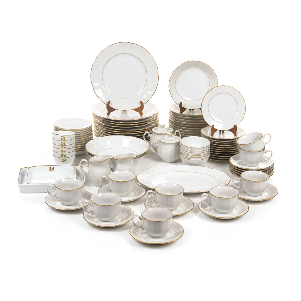 Consta de: 12 platos trinche, 12 platos para sopa, 12 platos para pan, 12 platos para postre, 6 tazones medianos, 6 tazones chicos, 12 tazas para café con 12 platos base, 2 azucareras, 2 cremeras, 2 ensaladeras y 3 platos de servicio.