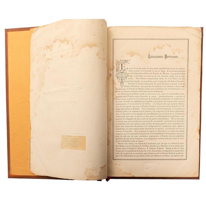 4o. marquilla, 114 p + 16 cuadros + 3 h. + 46 p. De la página 1: "… Mucho más ardua y de menos fácil resolución, que las que se refieren a nuestros límites con los Estados de Hidalgo, Querétaro y Morelos, es la cuestión pendiente entre el Estado de México y el Distrito federal. Desde el año de 1824 en que por la expedición de le ley de 18 de Noviembre, se desposeyó a nuestro Estado, de un girón de su territorio, para formar con él un Distrito Federal, se dio origen a las dificultades en que hasta el día nos hallamos envueltos con aquella entidad salida de nuestro seno. El Art. 2o. de la ley que acabo de citar, designo como fundo legal para el Distrito, un territorio de figura matemáticamente circular, cuya circunferencia tuviese todos sus puntos, a una distancia de dos leguas de la Plaza Mayor de México, lugar señalado para centro de aquel círculo…". Conserva pasta anterior original en rústica, manchada y con faltantes. Mancha de humedad de portada hasta la página 21. Encuadernado en pasta dura.