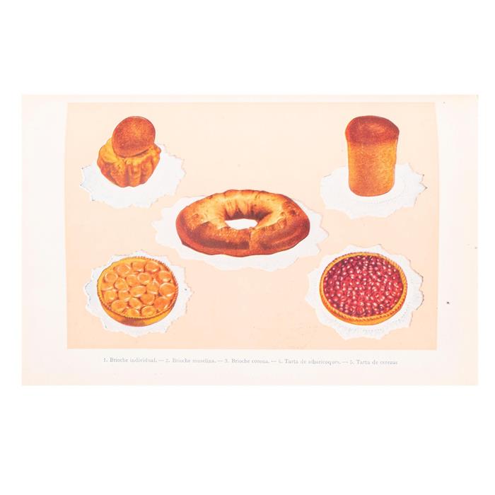 4o. marquilla, 551; 902 p. Confitería…: 10 láminas en color e ilustraciones intercaladas. La Cocina…: Seis láminas en negro, 11 láminas en color e ilustraciones intercaladas. Encuadernados en pasta dura. Piezas: 2.