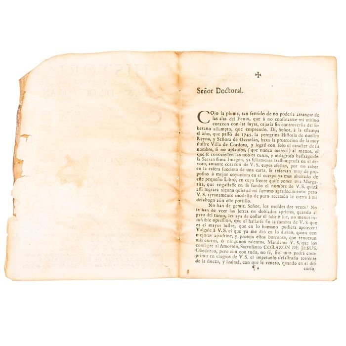 LOAYZAGA, MANUEL. HISTORIA DE LA MILAGROSSISIMA IMAGEN DE NRA. SRA. DE OCOTLAN QUE SE VENERA EXTRAMUROS DE LA CIUDAD DE TLAXCALA. MÉXICO: POR LA VIUDA DE D. JOSEPH HOGAL, 1750. 8o. marquilla, 13 h. + 146 p. + 1 h. Ponela reverente a la sombra del Deifico Sacrosanto Corazón de Jesús, en nombre del Sr. Dr. D. Antonio Joseph de Velasco y Texada, Canónigo Doctoral de la Santa Iglesia Metropolitana de México. Pastas y guardas afectadas por humedad, pasta posterior falta tercio superior; texto en buen estado. Encuadernado en pergamino. Estimado $7,000-12,000