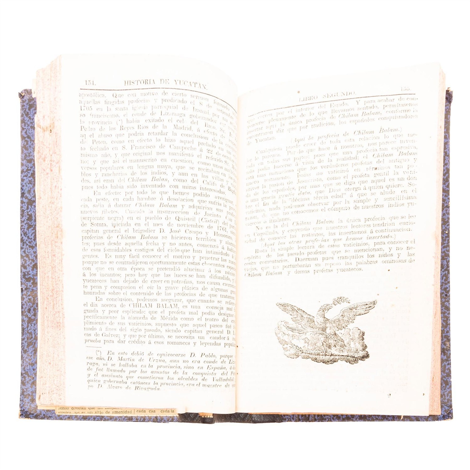 LOS TRES SIGLOS DE LA DOMINACIÓN ESPAÑOLA EN YUCATÁN O SEA HISTORIA DE ESTA PROVINCIA DESDE LA CONQUISTA HASTA LA INDEPENDENCIA. CAMPECHE: JOSÉ MARÍA PERALTA, 1842. 8o. marquilla. 481 p. + 3 h. Tomo I. Escribíola el R.P.Fr. Diego López Cogolludo, provincial que fue de la orden franciscana; y la continua un yucateco. Ejemplar con surcos y puntos de polilla, afecta poco texto. Encuadernado en pasta dura, lomo en piel. Considerada la segunda edición de la obra de Diego López Cogolludo; editada por Justo Sierra O'Reilly. Estimado $3,500-5,000