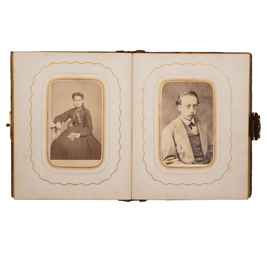 Tarjetero. Tarjetas de Visita. México, Siglo XIX. 28 fotografías de retratos de damas, caballeros y niños. Fotografías por J. Wenzin, Manuel Velasco, R. Sagrado, Casanova, Ag. Barraza, Octaviano de la Mora, D. de Olaguibel, Hierro y H. Bonilla y Luis Veraza. 13 hojas con dos retratos cada una y 2 hojas con un retrato cada una. Dos hojas rasgadas (una restaurada) y pastas con faltantes en bordes de incrustaciones. Encuadernado en pasta dura con incrustaciones de concha nácar, lomo en piel y broche de bronce. Estimado $8,000-10,000