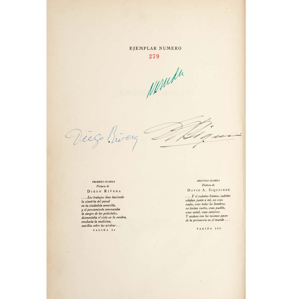 Edición de 500 ejemplares numerados del 1 al 500, 300 de ellos destinados a los suscriptores, firmados por Pablo Neruda, Diego Rivera y David Alfaro Siqueiros. Además 50 numerados B-1 al B-50 y 50 ejemplares sin numerar, unos y otros fuera de comercio. Ejemplar número 279, firmado por Pablo Neruda, Diego Rivera y David Alfaro Sequeiros.
