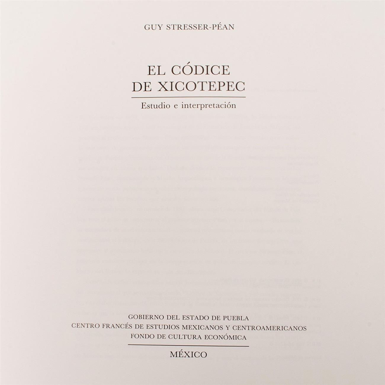 STRESSER-PÉAN, GUY. EL CÓDICE XICOTEPEC. MÉXICO: GOBIERNO DEL ESTADO DE PUEBLA - CENTRO FRANCÉS DE ESTUDIOS MEXICANOS Y CENTROAMERICANOS - FONDO DE CULTURA ECONÓMICA, 1995. 4o. marquilla. Texto: 209 p. Estudio e interpretación. Encuadernado en rústica. Facsímil: 28 pliegos en acordeón. Primera edición en español. Edición de 2,000 ejemplares numerados. Ejemplar No. 1502. Piezas: 2. En estuche. Estimado $1,300-3,000