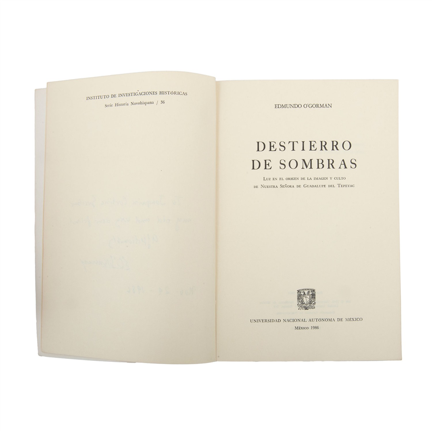 O'GORMAN, EDMUNDO / MAZA, FRANCISCO DE LA / MORENO ROBERTO. DESTIERRO DE SOMBRAS / LAS PIRAS FUNERARIAS / JOAQUÍN VELÁZQUEZ DE LEÓN. PIEZAS: 3. a) O'Gorman, Edmundo. Destierro de Sombras. Luz en el Origen de la Imagen y Culto de Nuestra Señora de Guadalupe del Tepeyac. México: Universidad Nacional Autónoma de México, 1986. 4o., 306 p. Encuadernado en rústica. b) Maza, Francisco de la. Las Piras Funerarias en la Historia y en el Arte de México. México: Universidad Nacional Autónoma de México, 1946. 4o. marquilla, 177 p. Grabados, Litografías y Documentos del Siglo XVI al XIX. Encuadernado en rústica. c) Moreno, Roberto. Joaquín Velázquez de León y sus Trabajos Científicos sobre el Valle de México. México: Universidad Nacional Autónoma de México, 1977. 4o., 407 p. Cuatro mapas y dos planos plegados e ilustraciones intercaladas. Encuadernado en rústica. Total de piezas: 3. Estimado $1,000-2,000