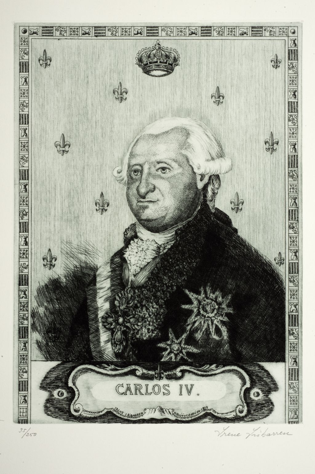 Aguafuertes correspondientes a Felipe V, Luis I, Fernando VI, Carlos III, Carlos V, Fernando VII, Isabel II, Alfonso XII, Alfonso XIII, Juan Carlos I, Príncipe de Asturias Don Felipe de Borbón y Grecia y un árbol genealógico.
