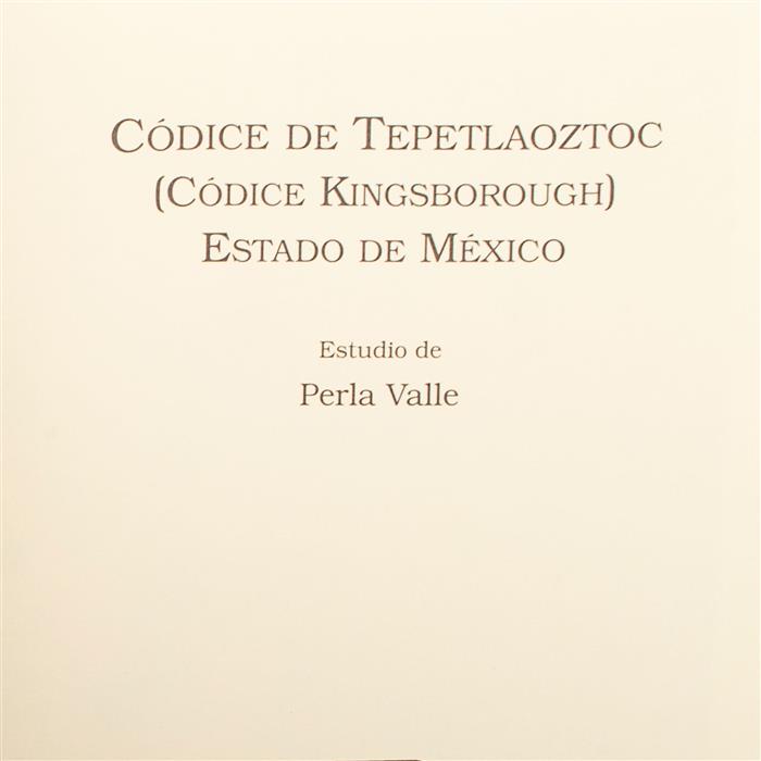 CÓDICE TEPETLAOZTOC (CÓDICE KINGSBOROUGH) / CÓDICE TECHIALOYAN DE HUIXQUILUCAN. a) Valle, Perla. Códice Tepetlaoztoc (Códice Kingsborough) Estado de México. México: El Colegio Mexiquense, 1994. fo. marquilla, 293 p.; facsímil. Texto encuadernado en rústica. Facsímil del códice encuadernado en pasta dura. En estuche. Piezas: 2. b) Harvey, Herbert. Códice Techialoyan de Huixquilucan (Estado de México). Toluca, México: Gobierno del Estado de México - El Colegio Mexiquense, 1993. 4o. marquilla, 105 p. + facsímil. Encuadernado en pasta dura, en estuche. Total de piezas: 3. Estimado $3,000-4,000