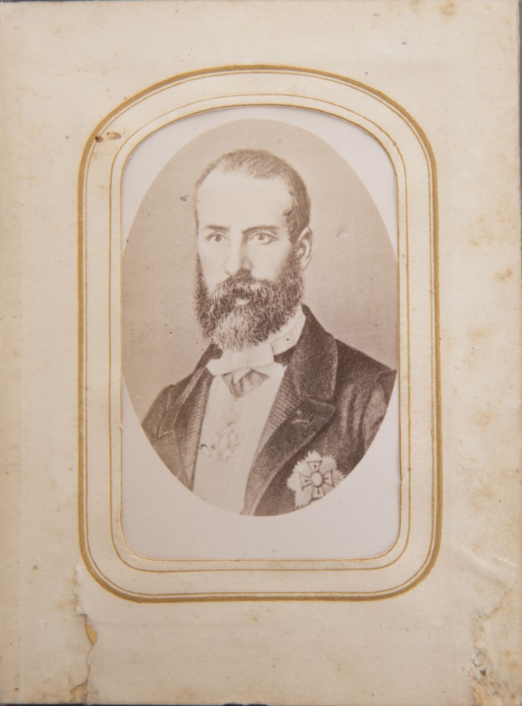 Álbum con 26 cartas de visita de los principales gobernantes y presidentes de México. Al reverso, cada tarjeta lleva un texto impreso con una breve reseña sobre la vida y obra de la persona retratada. Álbum en pasta dura en piel con hierros dorados y broche de metal.