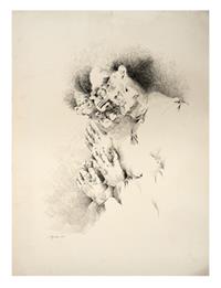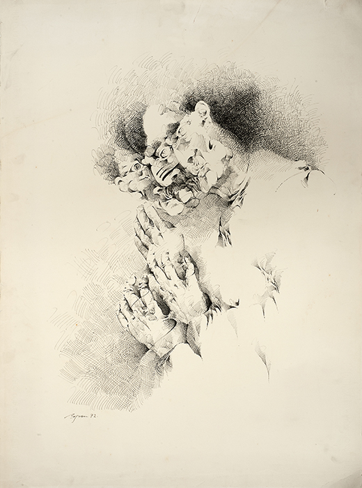 Z - Gálvez, Byron. Personajes Duales. Tinta sobre papel. 75.5 x 56 cm. Firmada y fechada, 76. Byron Gálvez (1941- ) Mixquiahuala, Hidalgo. Egresado de la Academia de San Carlos, se forjó con una generación de maestros de primer nivel. En 1964 montó su primera exposición y desde entonces ha realizado un centenar de exposiciones, tanto en México, E.U., Europa y Latinoamérica. Estimado $6,000-8,000