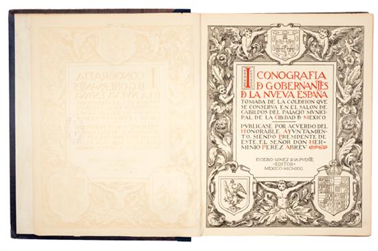 B - Gomez de la Puente, Eusebio. Iconografía de Gobernantes de la Nveva España. México: Evsebio Gomez de la Pvente, 1921. fo. marquilla, 5 h. + biografías. Fue autor de los adornos y dibujos, Don Valerio Prieto, de la Academia Nacional de San Carlos; grabador, Don Ezequiel Alvarez Tostado; grabador de las planchas, Don Francisco Patiño; e impresor de las tricomias, Don Agustín Casas. Ejemplar No. 515. Con sellos de antiguo propietario. Profusamente ilustrado. Lomo y pastas gastados. Encuadernado en pasta dura. Estimado $5,000-6,000