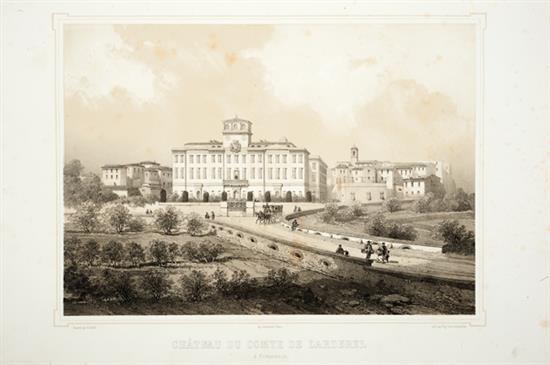Larderel, Le Comte de. Album des Diverses Localités Formant les Établissemens Industriels d'Acide Boracique. Paris: Lemercier, sin año. fo. doble marquilla, 24 láminas. Fondés en Toscane (1818). Incluye un retrato del Conde Larderel. Manchas de óxido. Cofia rota, pastas deterioradas. Encuadernado en pasta dura, en piel. François Jacques, Comte de Larderel (1789 - 1858) fue un ingeniero francés e inmigrante toscano que hizo una fortuna perfeccionando la técnica de extracción del ácido bórico de los vapores de los lagos toscanos. Estas litografías muestran la villa Toscana antes y después de las construcciones filantrópicas de Lardereles; es un registro de la yuxtaposición de lo natural y lo industrializado. Es probable que esta obra sea el intento del Conde por mostrar el progreso industrial de la región, sin embargo, es difícil observarla hoy en día sin considerarlo como un registro de un ideal preindustrial ya desaparecido. El Conde de Larderel hizo un enorme éxito de su técnica e industria y obtuvo un título nobiliario en 1846 por Leopold II como el Conde de Montecerboli. Estimado $18,000-22,000