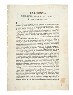 DI - Iturbide, Agustín de (Presidente Regente) / Bárcena, Manuel de la / Yañez, José Isidro / Velázquez de León, Manuel / Antonio, Obispo de la puebla. Comunicado. "La Regencia Gobernadora Interina del Imperio, á sus habitantes. La reunion de un Congreso nacional que forme la Constitucion de este Imperio fué el primer cuidado del Actual Presidente de la Regencia, y el objeto mas señalado de su atencion en los artículos 5, 10 y 24 del Plan que describió en Iguala para el pronunciamineto de la Independencia del mismo Imperio. A este interesante objeto dirijió tambien las prevenciones de los artículos 10 y 12 de los Tratados de Córdoba... La Soberana Junta, en el decreto que con esta fecha se publica, ha prescripto ya las reglas y método de la elecciones, ha señalado el tiempo de ellas, y ha fijado el día de la apertura é instalación del Congreso. Anuncia pues la Regencia con indecible placer á la Nación Mexicana, la proximidad del momento en que á consecuencia de la solemme declaración de su independencia y libertad constituia gloriosamente su Imperio... ... aunque los derechos del hombre son unos, é imprescriptibles en todo tiempo y pais, no pueden ser uniformes la organizacion de cada Gobierno, y un sistema trepresentativo; y que esta diferencia tan palpable, aun entre naciones de igual ilustracion, no puede referirse mas que á la fuerza irresistible de aquel principio supremo de política, que obliga á todo pueblo á que acomode á sus peculiares circunstancias la forma de su gobierno, y el sistema de su representacion nacional. ...Léjos ahora de vosotros toda aquella ligereza y vicios que hayan podido notarse en las elecciones que han precedido. Guárdese en ellas la forma que dió la Constitucion española para el arreglo de las Juntas electorales; pero sea este tal, que cada uno explique libremente su voto: que no haya confusion ni abusos: que en el tiempo y el modo de concurrencia no se cause desórden alguno; y que todos queden satisfechos de haber desempeñado dignamente lo que toca á cada ciudadano, y lo que todo ciudadano debe á su Nacion.". México Noviembre 18 de 1821. Rúbricas. Con pequeños faltantes en margen interno. Con mancha de grasa en esquina inferior, sin afectar texto. El 27 de septiembre de 1821 ingresa a la capital mexicana el ejército trigarante, al día siguiente se proclama la Independencia del Imperio Mexicano por la Junta Provisional Gubernativa, la cual nombró a quienes conformarían la Regencia del Imperio quedando conformada por Agustín Iturbide (presidente), Juan O'Donojú, Isidro Yáñez, Manuel de la Bárcena y Manuel Vázquez de León. El 8 de octubre del mismo año muere Juan O'Donojú quedando en su lugar Antonio Joaquín Pérez (Obispo de Puebla). La Junta Provisional Gubernativa puso en marcha el proceso de las elecciones para la cámara, tomándose la decisión de cómo sería la convocatoria y la forma de cómo se consideraría las representaciones, finalmente la convocatoria por decreto fue expedida el 17 de Noviembre de 1821 por la cual quedarían 169 diputados electos. En dicho decreto se menciona que la Junta Provisional Gubernativa no modificaría la Constitución ni dictaría leyes debido a que eso le correspondía al Congreso. El 24 de Febrero de 1822 empezó a sancionar el Congreso y el 19 de mayo fue nombrado como emperador a Iturbide, quien decreto su disolución el 31 de Octubre, formando la Junta Instituyente integrado por varios diputados disueltos el 13 de Noviembre. Estimado $16,000-20,000