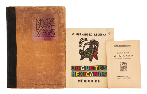 A - Fernández Ledesma, Gabriel / Montenegro, Roberto. Juguetes Mexicanos / Calzado Mexicano / Máscaras Mexicanas. a) Fernández Ledesma, Gabriel. Juguetes Mexicanos. Mexico D.F.: Talleres Gráficos de La Nación, 1930. 4o., 53 p. + 52 láminas con hoja explicativa. Pastas gastadas. Encuadernado en rústica. b) Fernández Ledesma, Gabriel. Calzado Mexicano. Cactlis y Huaraches. México: Serie de Arte, 1930. 8o. marquilla, 15 p. + XXXIV láminas. Encuadernado en rústica. c) Montenegro, Roberto. Máscaras Mexicanas. México: Secretaría de Educación Pública, 1926. 4o. marquilla, CXXXIV. Manchas de óxido. Encuadernado en pasta dura. Total de piezas: 3. Estimado $7,000-9,000