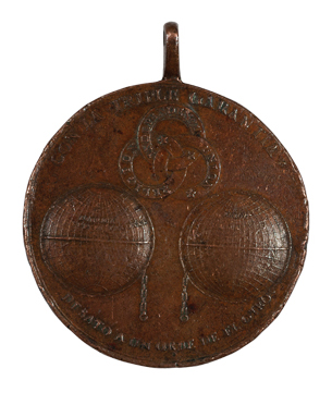 Z - Medalla del Ejército Trigarante. En cobre, 50 mm. En el anverso dos mundos (el viejo y el nuevo), cada uno con una cadena desatada. En la parte superior se ven tres círculos entrelazados con la inscripción: 'Independencia, religión, unión'. En el perímetro se lee también: 'Con la triple garantía desató a un orbe del otro'. En el reverso se ve solamente una corona de laurel acompañada de la leyenda 'Segunda época' en la parte inferior, la firma del grabador. Estas medallas fueron entregadas entre el 16 de Junio y el 2 de Septiembre de 1821. Se debían de usar al lado izquierdo del pecho, con un listón verde, blanco y rojo. Destinada a sargentos, cabos, tambores y soldados. Estimado $9,000-11,000