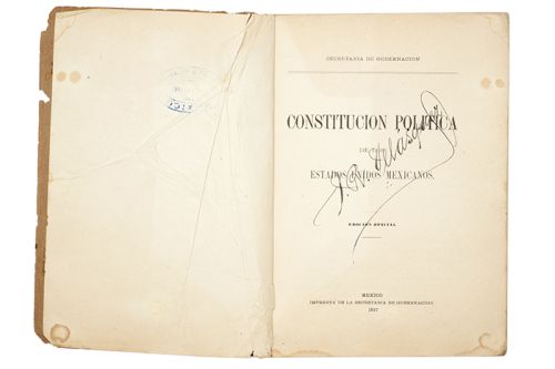 D - Carranza, Venustiano. Constitución Política de los Estados Unidos Mexicanos. México: Imprenta de la Secretaría de Gobernación, 1917. 8o. marquilla, 118 p. Practicamente sin lomo, pastas con faltantes al margen, manchas de humedad. Encuadernado en rústica. Estimado $4,000-5,000