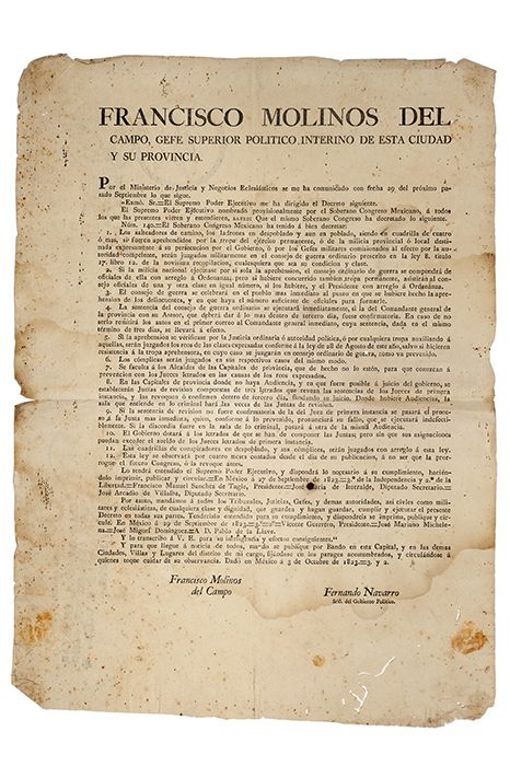 DI - Molinos del Campo, Francisco. Bando. "... El Soberano Congreso Mexicano ha tenido á bien decretar: I. Los salteadores de caminos, los ladrones en despoblado y aun en poblado, siendo en cuadrilla de cuatro ó mas, si fueren aprehendidos por la tropa del ejército permanente, ó de la milicia provincial ó local destinada expresamente á su persecución por el Gobierno, ó por los Gefes militares comisionados al efecto por la autoridad competente, serán juzgados militarmente en el conejo de guerra ordinaro prescrito... cualesquiera que sea su condición ó clase...". Dado en México á 3 de Octubre de 1823. Con surcos de polilla, no afecta texto, mancha de humedad. Estimado $4,000-5,000