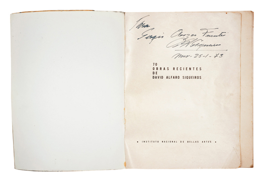 A - Siqueiros, David Alfaro. 70 Obras Recientes. México: INBA - Museo Nacional de Artes Plásticas - SEP, 1947. 4o. marquilla, 122 p. Dedicado, firmado y fechado por el autor. Sin lomo, restaurado, y pastas enmicadas. Encuadernado en rústica. Estimado $6,000-8,000