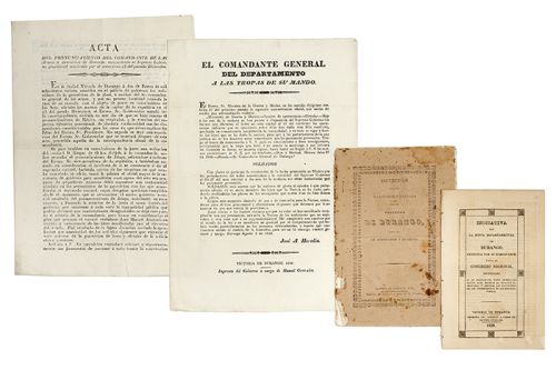 DI - Documentos de Durango. Acta / Noticia / Comunicación / Iniciativa. Documentos de Durango. a) Acta del Pronunciamiento del Comandante de las Armas y Guarnición de Durango, reconociendo el Supremo Gobierno provisional nombrado por el consejo en 23 del pasado Diciembre. "En la ciudad Victoria de Durango á dos de Enero de mil ochocientos treinta, reunidos en el palacio de gobierno los individuos de la guarnición de la plaza, á mocion del Sr. comandante general de las armas… con el objeto de poner en conocimiento de los Sres. Oficiales los sucesos de la capital de la república en el 23 del pasado Diciembre: el Escmo. Sr. Gobernador mandó lér la correspondencia recibida en este día de que se hizo constar el pronunciamiento de México, sus resultados, y la ereccion del supremo ejecutivo provisional, de absoluta conformidad con las disposiciones constitucionales para los casos en que deben suplirse las faltas del Escmo. Sr. Presidente…". Victoria de Durango: Imprenta liberal dirijida por Manuel González, 1830. b) Palacio, Francisco G. Documentos relativos a la Comision mandada por el Gobierno de Durango, cerca del de Nuevo León y Coahuila. Victoria de Durango: Imprenta del Gobierno á cargo de M. Gonzalez, 1859. 8o. marquilla, 16 p. Comisión ordenada por el Gobierno de Durango, luego de la invasión de tropas de Nuevo León y Coahuila, al mineral de Cuencamé, Dgo. Ejemplar con mancha de humedad en punta superior, pastas gastadas, con faltantes. Encuadernado en rústica. c) Heredia, José A. El Comandante General del Departamento a las Tropas de su Mando. "... con placer os participo la terminación de la lucha promovida en México por los perturbadores del órden sometiéndose á la autoridad del Supremo Gobierno el día 27 del mes anterior á las seis de la mañana, sin otras concesiones que las puramente personales. SOLDADOS: este suceso que ha cubierto de gloria al ejército á que perteneceis afianza de un modo duradero las leyes que la Nacion se ha dado, quedando confundidos los planes de los anarquistas que tantos días de luto dieron á la patria…". Victoria de Durango: 1840. Imprenta del Gobierno á cargo de Manuel González. d) Castañeda, Marcelino. Iniciativa de la Junta Departamental de Durango, Presidida por el Gobernador, eleva al Congreso Nacional. Victoria de Durango: Imprenta del Gobierno á cargo de Manuel González, 1839. 80. marquilla, 10 p. Secundando la de Guanajuato, sobre armar a la nación para repeler la invasión estrangera, y ampliar las facultades de los gobernadores de los Departamentos.Encuadernado en rústica. Total de piezas: 4. Estimado $3,500-4,500