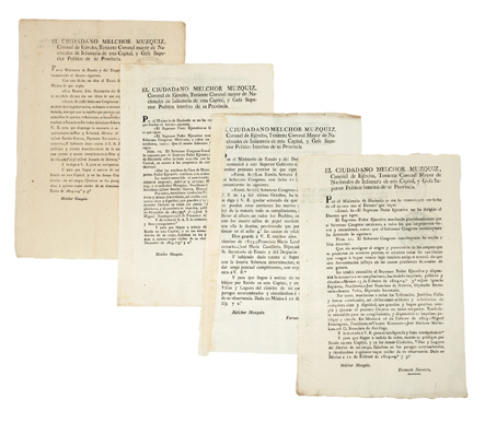 DI - Muzquiz, Melchor. Bandos. a) "Por el Ministro de Estado y del Despacho de Hacienda, comunico á este Supremo Gobierno con fecha 22 de Noviembre próximo anterior lo que sigue. Exmô. Sr. = El Soberano Congreso en vista del oficio de V. E. de 14 del último Octubre, ha tenido a bien resolver se diga á V. E. quedar enterado de que hasta el 1o. de Enero no pueden estar corrientes los nuevos sellos, ni darse á la ley de la materia todo su cumplimiento, mas que disponga llevar al efecto en todos los Pueblos, en cuanto pueda ser, con los cuatro sellos de papel corriente en los objetos á que ella le destina, previniendo que por ahora han de continuar en el sello 4o. las causas de oficio... Francisco María Lombardo, Diputado Secretario. = José María Castillero, Diputado Secretario. = Exmo. Sr. Secretario de Estado y del Despacho de Hacienda....". Dado en México á 11 de Diciembre de 1823. b) "Por el Ministro de Hacienda se me ha comunicado con fecha de 24 del que finaliza en decreto siguiente. Núm. 10. El Soberano Congreso Constituyente Mexicano en vista de lo expuesto por el Supremo Poder Ejecutivo por el conducto del Ministro de Hacienda sobre la duda ocurrida con la Diputación Provincial de esta Capital, en cuanto á las propuestas de ciertos empleos, se ha tenido á bien decretar: Que los empleos de Casa de Moneda los provea por ahora el Supremo Poder Ejecutivo conforme a la ordenanza de la de Mexico. Tendreislo entendido para su cumplimiento, y dispondrías se imprima, publique y circule... José Mariano Michelena, Presidente. = Miguel Domínguez. = A. D. Francisco Arrillaga...". Dado en México á 31 de Diciembre de 1823. c) "Por el Ministro de Estado y del Despacho de Relaciones se me ha comunicado el decreto siguiente. Con esta fecha me dice el Exmo. Sr. Ministro de Guerra y Marina lo que copio. Exmô. Sr. = El Soberano Congreso se ha servido acordar: que ninguna providencia gubernativa, ordinaria o estraordinaria se consulte con su Soberanía, si no que con la rapidez que parezca oportuna obre el Gobierno en todo como bien le parezca. = Asimismo se ha servido acortar que su Soberanía se traslade á Palacio... José Joaquín de Herrera...". Dado en México a 27 de Enero de 1824. d) "Por el Ministro de Hacienda se me ha comunicado con fecha de 18 de este mes el Decreto que copio. Núm. 22. El Soberano Congreso constituyente ha tenido a bien decretar. Que sin averiguar el origen y procedencia de los azoguez que presentan en nuestros puertos, se admitan todas las cantidades que vengan ó hayan venido bajo la bandera amiga o neutral, sin que esta determinación influya en las causas pendientes de comiso de este género... Tendreislo entendido para su cumplimiento, y dispondrías se imprima, publique y circule... Miguel Domínguez, Presidente. = Vicente Guerrero. = Jose Mariano Michelena. = A. D. Francisco Arrillaga...". Dado en México á 21 de Febrero de 1824. Total de piezas: 4. Estimado $7,000-9,000
