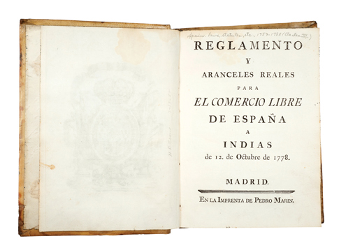 D - Consejo de Indias. Reglamento y Aranceles Reales para el Comercio Libre de España a Indias de 12 de Octubre de 1778. Madrid: Pedro Marin, 1778. 4o. marquilla, 2 h. + 19 + 262 p. + 23 h. en blanco. Primera edición. Con una lámina (grabado de escudo de armas). Con Exlibris de "Los Angeles Board of Law Library Trustees". Refinado y con cajo interior quebrado. Encuadernado en pergamino de época. Con este reglamento se marca el fin del monopolio de comercio que mantenían las ciudades de Cádiz y de Sevilla con la América española, por primera vez permitiendo a otras ciudades a participar. También incluye el texto las concesiones otorgadas a Luisiana. Entre 1765 y 1776 el gobierno reformador de Carlos III desmanteló el marco restrictivo del comercio colonial que tenían ya siglos de antigüedad. Los aranceles se redujeron, los monopolios de Cádiz y Sevilla se abolieron, se abrieron rutas de comercio entre los puertos de España y el Caribe y autorizaba el comercio intercolonial por vez primera. En 1778, el comercio libre se extendió a Buenos Aires, Chile y Perú. Pero el comercio de América no pudo responder con la suficiente rapidez a las fuerzas externas: se mantuvo esencialmente subdesarrollado y hambriento de inversiones, abierto a las importaciones, pero por debajo de las exportaciones. El resultado era predecible: una salida incontrolable de lingotes, uno de los pocos productos americanos para los que había una demanda mundial constante. El presente reglamento fue, sin embargo, uno de los documentos más progresistas de la España del siglo XVIII en cuanto a libre comercio. Estimado $12,000-15,000