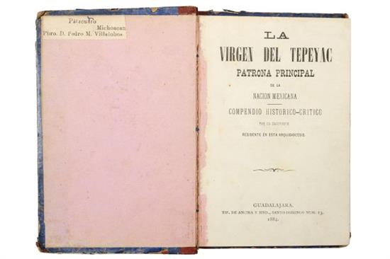 R - Por un Sacerdote. La Virgen del Tepeyac / Defensa de la Aparición. a) Por un Sacerdote Residente en esta Arquidiócesis. La Virgen del Tepeyac. Patrona Principal de la Nación Mexicana. Guadalajara: Tip. de Ancira y Hno., 1884. 8o., 368 p. + 1 h. Con una lámina. Lomo y pastas gastados. Encuadernado en pasta dura, lomo en piel. b) Por un Sacerdote de la Compañía de Jesús. Defensa de la Aparición de la Virgen María en el Tepeyac. Puebla: Imprenta del Colegio Pío de Artes y Oficios, 1893. 8o. marquilla, 338 p. + 2 h. Portada en fotocopia. Mancha de humedad en el margen interno de las primeras 20 páginas. Encuadernado en pasta dura, lomo en piel. Total de piezas: 2. Estimado $4,000-5,000