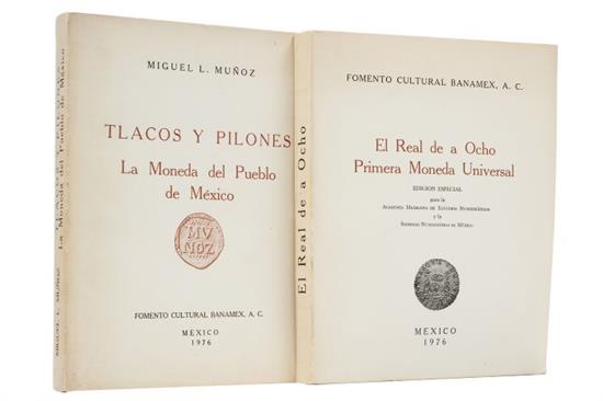 NU - Muñoz, Miguel L. / Bátiz, José Antonio (Introducción). Tlacos y Pilones / El Real de a Ocho. a) Muñoz, Miguel L. Tlacos y Pilones. La Moneda del Pueblo de México. México: Fomento Cultural Banamex, 1976. 4o. marquilla, 356 p. + láminas. Pastas gastadas. Encuadernado en rústica. b) Bátiz, José Antonio (Introducción). El Real de a Ocho. Primera Moneda Universal. México: Fomento Cultural Banamex, 1976. 4o. marquilla, 320 p. Pastas gastadas. Encuadernado en rústica. Total de piezas: 2. Estimado $3,000-4,000