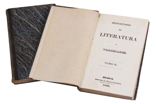 P - Repertorio de Literatura y Variedades. México: Imprenta del Repertorio, 1840 - 1841. 4o. marquilla, 315; 330 p. Tomos I - II. Tomo I: 39 láminas y un plano. Tomo II: 38 láminas. Lomos deteriorados, príncipalmente el del T. I, sin pie y cajos quebrados en cofia. Encuadernados en pasta dura, lomo en piel. Piezas: 2. Estimado $6,000-8,000