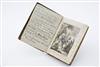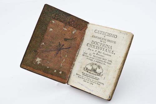 R - Ripalda, Gerónimo de. Catecismo y Exposición Breve de la Doctrina Christiana. Impreso en Puebla de los Ángeles: En la Oficina de D. Pedro de la Rosa, 1784. 8o. marquilla, 13 h. + 188 p. Con un tratado muy util del órden con que el Christiano debe ocupar el tiempo, y emplear el día. Con un grabado de Jphus. Nava Sc., Angelopoli a 1784, recortado y rasgado, restaurado, rayado con lápiz de color. Portada con sello de antiguo propietario al reverso de la misma nota manuscrita. Pastas y lomo muy gastados, sin cofia y pie. Encuadernado en pasta dura, en piel. Palau: 268740. No menciona grabado. Estimado $3,000-4,000
