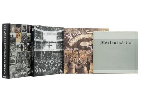 Treviño, Estela / Reyes, Aurelio de los / Barros, Cristina / Zarebska, Carla. 160 Años de Fotografía en México / Cine y Sociedad en México 1896 - 1930 / Vida Cotidiana Ciudad de México 1850 - 1910 / México Inédito. a) Treviño, Estela. 160 Años de Fotografía en México. México: CONACULTA - CENART / Centro de la Imagen / Océano / Fundación Televisa, 2004. 4o. marquilla, 703 p. Presentación de Sari Bemúdes. Encuadernado en pasta dura. b) Reyes, Aurelio de los. Cine y Sociedad en México 1896 - 1930. México: Instituto de Investigaciones Estéticas - UNAM, 2010. 4o. marquilla, 409 p. Bajo el Cielo de México. Volumen II (1920 - 1924). Encuadernado en rústica. c) Barros, Cristina; Buenrostro, Marco. Vida Cotidiana Ciudad de México 1850 - 1910. México: CONACULTA / Lotería Nacional / UNAM / Fondo de Cultura Económica, 1996. 4o. marquilla, 195 p. Primera edición. Encuadernado en rústica. d) Zarebska, Carla; Gomez de Tuddo, Alejandro. México Inédito. México: Basilisco Editores / Archivo General de la Nación / Secretaría de Gobernación / CONACULTA - INBA, 1999. 4o. marquilla, 61 p. Fotografías del Archivo General de la Nación. Encuadernado en pasta dura. Total de piezas: 4. Estimado $3,000-4,000