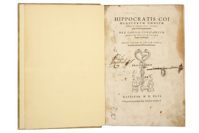 ME - Hipócrates. Hippocratis Coi Medicorvm omnivm longe principis, opera quae ad nos extant omnia Basileae: Froben, 1546. 4o. marquilla, 5 h. + 695 p. + 10 h. (índice). Per ianvm cornarivm medicvm physicvm latina lingua conscripta. Index rervm ad calcem operis, uniuerfi annexus eft foecundifsimus. Letras capitulares grabadas. Portada y última hoja de texto con firma manuscrita de antiguo propietario. Firmado. Con anotaciones y marginalia en español. Rotura restaurada en el margen externo de las primeras 5 hojas. Encuadernado en pergamino. Contiene los principales principios y conceptos desarrollados por Hipócrates, considerado el padre de la medicina. Incluye el desarrollo de su teoría de los cuatro humores y otras nociones sobre medicina. Estimado $22,000-26,000