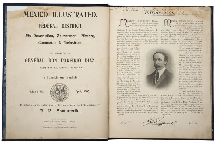 P - Southworth, J. R. México Ilustrado Distrito Federal. México: Publicado bajo la autorización del Gobierno del Distrito por J. R. Southworth, 1903. fo., 168 p. + 2 h. + anuncios. Su descripción, gobierno, historia, comercio e industrias. La biografía del Sr. General D. Porfirio Diaz. Texto en español e inglés. Dibujos de Julio Ruelas. Con fotografías de Kahlo, Carmichael y Ravell. Tomo VII - 1903. Con dedicatoria manuscrita del autor en el margen superior de la primera hoja, ligeramente recortado. Conserva pastas originales, con faltante en la pasta anterior en la esquina superior derecha. Mancha de humedad en el margen superior, afectando las primeras y últimas hojas. Encuadernado en pasta dura, lomo en piel. Estimado $5,000-7,000