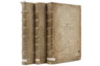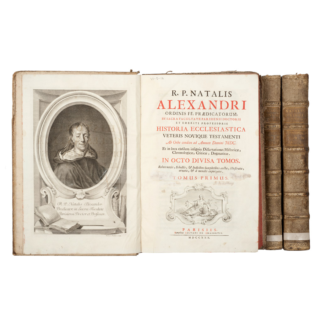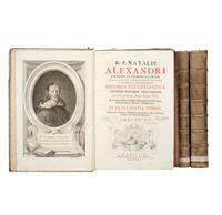 R - Natalis, Alexandri. Historia Ecclesiastica Veteris Novique Testamenti: Ab Orbe Condito Ad Annum Domini MDC. Parisiis: Silvani de Grasortis, 1730. fo. marquilla, 9 h. + 519 p.; 2 h. + 421 p.; 3 h. + 818 p. Tomo I - Con frontispicio (rasgado) y Ex Libris de G. Huennekes. Cofia deteriorada, interior de pastas dañadas por polilla. De puntos a surcos de polilla en 7 primeras y 6 últimas hojas sin afectar texto. Tomo II - Pasta posterior con faltantes. Páginas 379 y 387 rasgadas y restauradas con cinta adhesiva, faltan páginas 381 a la 386. Tomo III - Con cofia rasgada. Surcos de polilla en las dos primeras y 3 últimas hojas sin afectar texto. Encuadernados en pasta dura. Piezas: 3. Estimado $6,000-8,000