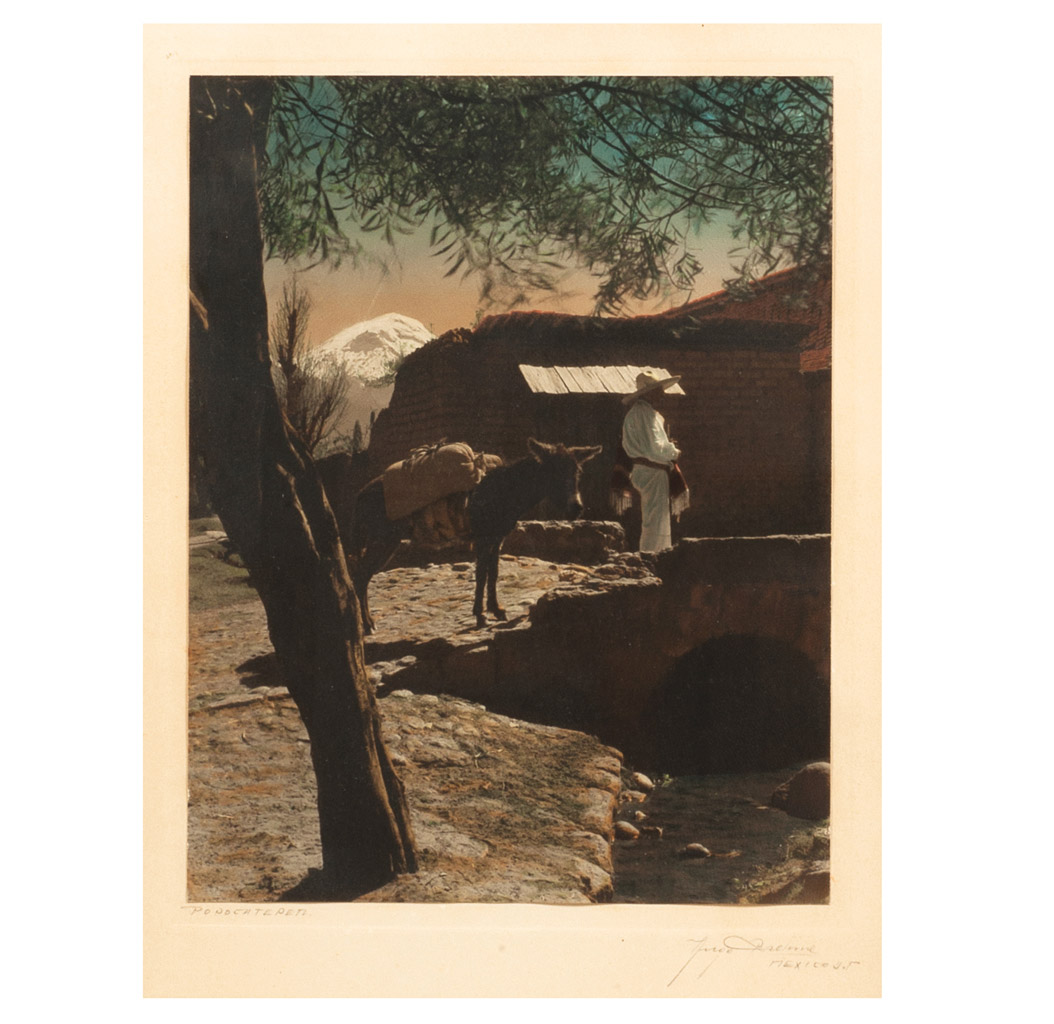 Brehme, Hugo. Popocatepetl. Fotografía coloreada, 33.4 x 26.2 cm. Firmada a lápiz. Enmarcada. Estimado $12,000-14,000