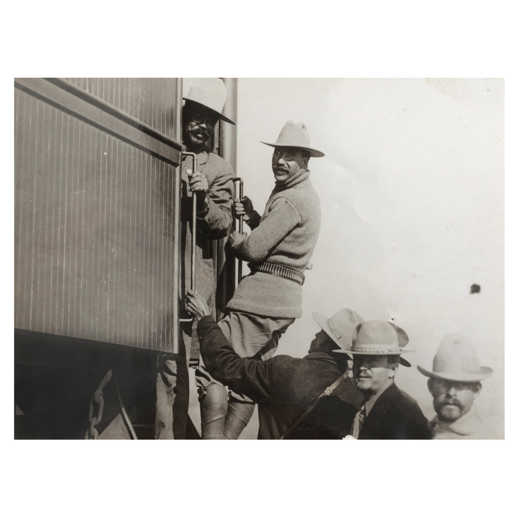Aultman, Otis. "General Villa, leaving final instructions to his lieutenants, before returning to Juarez in a captured federal train". Nueva York: The International News Service, 1914. Fotografía en blanco y negro, 18 x 13 cm. Con sello y leyenda al reverso. Se puede distinguir a Eugenio Aguirre Benavides a la derecha de Pancho Villa. Aguirre fue nombrado por Villa Comandante de la Brigada Zaragoza y lucho a su lado contra los carrancistas. Con pequeño faltante en parte inferior. Aultman, OTIS A. (1874-1943). Nació el 27 de agosto de 1874 en Holden, Missouri. Su familia se trasladó a Colorado en 1888. De joven aprendió fotografía de su hermano mayor Oliver. En 1908 después de su divorcio se traslada a El Paso en donde trabajó por primera vez para la Scott Photo Company, más tarde trabaja en colaboración con Robert Dorman y finalmente se logra hacer dueño de su propio estudio. En 1911 El Paso era un lugar de reunión para personalidades de la Revolución Mexicana: Francisco Madero, Francisco (Pancho) Villa, Pascual Orozco. Después de que estallara el conflicto, muchos periodistas estadounidenses acudieron a El Paso para cubrir la guerra. Aultman fue un hombre que estuvo en el lugar correcto en el momento adecuado, y se involucró profundamente en el conflicto Mexicano. Fotografió la batalla de Casas Grandes, la primera batalla de Juárez, mayo 1911 y la rebelión de Orozco en 1912. Él era un favorito de Pancho Villa, quien apodo a Aultman "Banty rooster" (refiriéndose a una raza pequeña pero agresiva de gallos) porque media 1.60 cm de altura. Aultman trabajó para el "International News Service", agencia a la que remitió la presente foto y para Pathé News con los que experimentó con la cinematografía. En 1916 fue uno de los primeros fotógrafos en llegar a Columbus (Nuevo México), después del famoso ataque en esa ciudad por los villistas. Por su cercanía a Pancho Villa, Aultman tuvo acceso a tomas que pocos fotógrafos podían. Es por eso que la presente foto es tan excepcional y rara, de entre las fotografías existentes de la Revolución Mexicana. Estimado $10,000-14,000