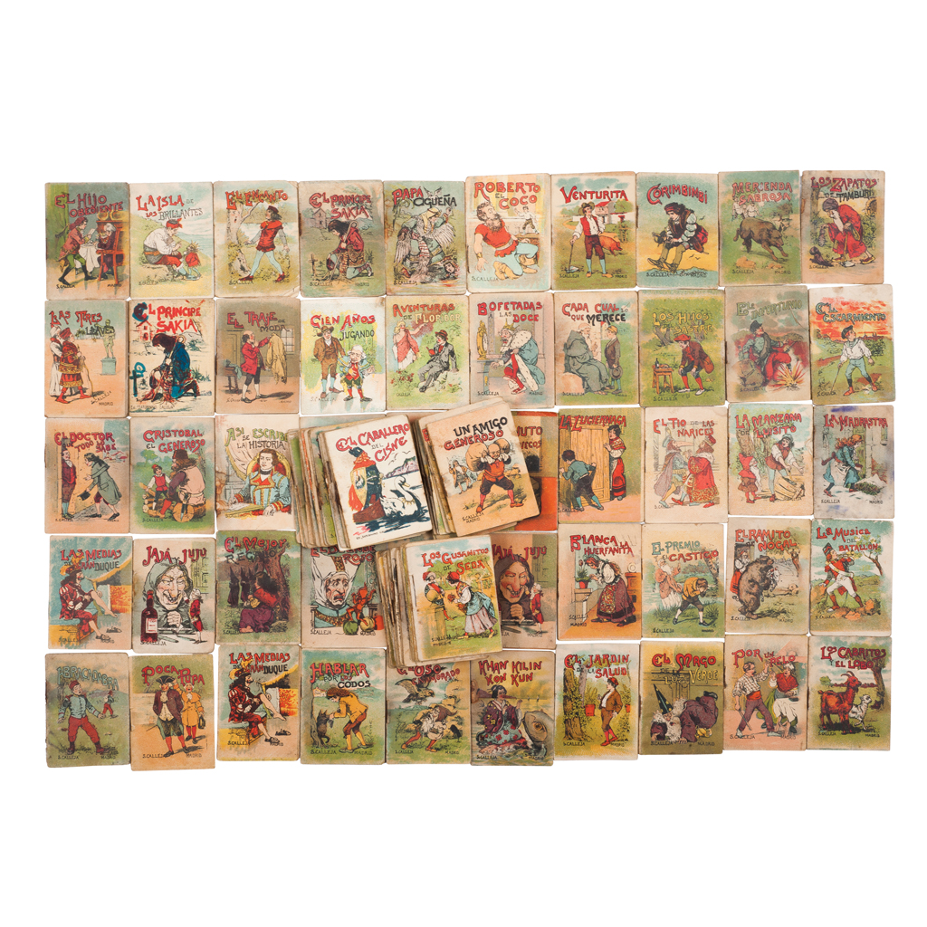 L - Calleja, Saturnino. Cuentos de Calleja. España: Editorial Saturnino Calleja. 64o. marquilla, 15 p. cada uno. Juguetes Instructivos. Números descontinuos de las series I - XV. Algunos títulos: Hablar por los codos, Las medias del gran Duque, El Alcalde de Cascanueces, Un Dentista original, El Rey Mondregas, Los siete cuervos, El hijo obediente, Cumplir con su deber, etc. Pastas ilustradas y coloreadas. Números 6, 13, 29, 74, 191, 213, 274, 275 y 280 sin pastas; números 199, 277 y 293 con pastas desprendidas; número 116 con puntas recortadas; número 153 con faltante en punta superior, afecta pasta anterior y hasta la página 12. Encuadernados en rústica. Piezas: 101. Estimado $8,000-10,000