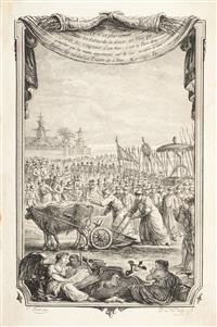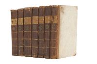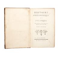 HU - Raynal, Guillaume Thomas. Histoire Philosophique et Politique des Établiffemens & du Commerce des Européens dans les deux Indes. La Haye, 1774. 8o. marquilla, XII + 585; XII + 411; XIII + 586; XII + 508; XII + 407; VII + 375; XI + 430 p. Una lámina y un mapa plegado en cada tomo. Mapas de: "M. Bonne". Tomo I: Pastas gastadas, lomo gastado y desprendido de parte superior, sin un pedazo de cofia, mapa rasgado, lámina restaurada; Tomo II: Pastas, lomo, cofia y pie gastados; Tomo III: Pastas, cofia y pie gastados, lomo y mapa rasgado; Tomo IV: Pastas, lomo y pie gastados, sin un pedazo de cofia, cajo anterior quebrado, mapa rasgado; Tomo V: Pastas, lomo, cofia y pie gastados, cajo anterior quebrado; Tomo VI: Pastas, lomo, pie gastados, sin cofia, mapa rasgado; Tomo VII: Pastas, lomo y pie gastados, sin cofia, mapa rasgado. Encuadernados en pasta dura, lomo y puntas en piel. Piezas: 7. Segunda edición de esta obra histórica de tendencia anticolonialista y encuadrada dentro del ambiente de la ilustración francesa. En su escritura colaboraron algunos de los principales pensadores ilustrados, entre ellos Diderot y el Barón de Holbach. La obra se publicó por primera vez en 1770 y estaba originalmente compuesta por 6 volúmenes. Por su controvertido contenido político y social fue prohibida en 1772, y no fue sino hasta 1774 que Raynal volvió a editarla, agregando un séptimo volumen a la obra. A partir de dicho año, la obra se reeditaría en numerosas ocasiones y en gran variedad de idiomas. Estimado $15,000-20,000