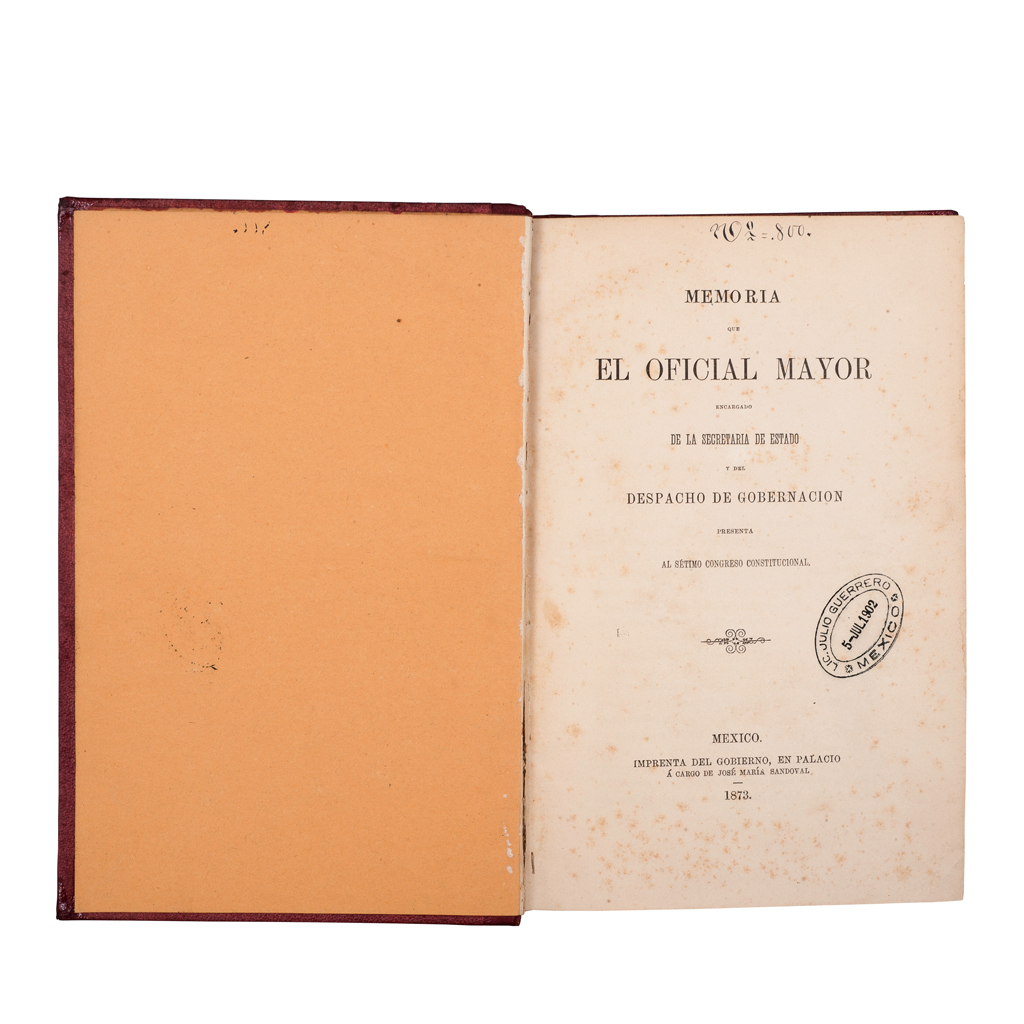 MM - Gomez y Pérez, Cayetano. Memoria que el Oficial Mayor Presenta al Séptimo Congreso Constitucional. México: Imprenta del Gobierno, en el Palacio a cargo de José María Sandoval, 1873. 4o. marquilla, 194 + 149 p. Con 12 estados, noticias y cuadros plegados. Cofia con faltante y cajo anterior quebrado. Portada con sello de antiguo propietario. Encuadernado en pasta dura, lomo en piel. Estimado $6,000-8,000