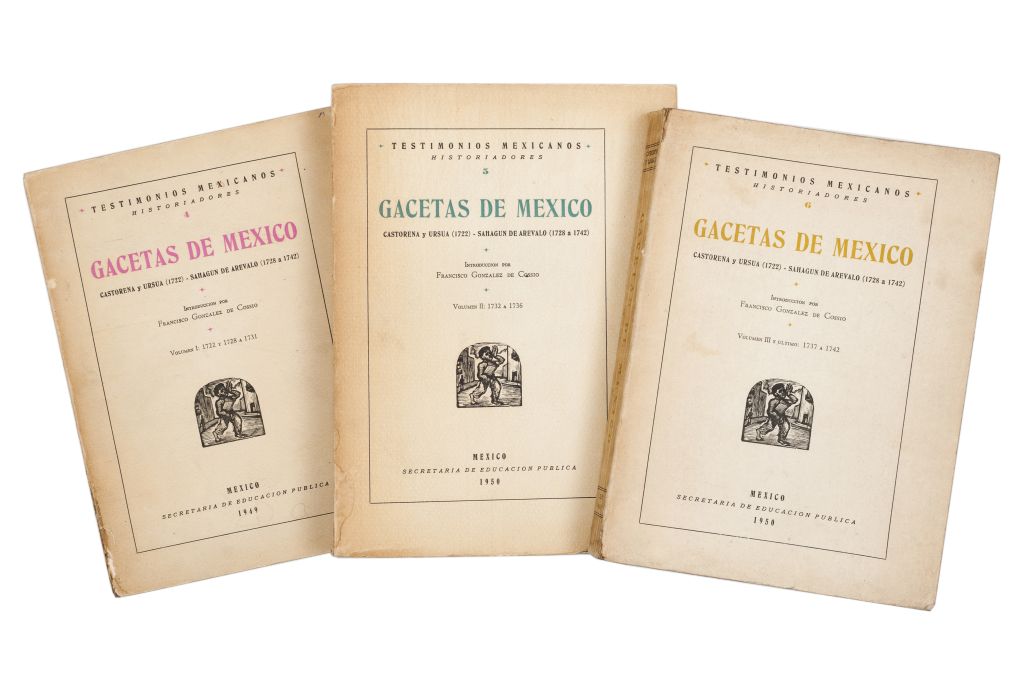 P - Castorena y Ursua - Sahagún de Arévalo. Gacetas de México. México: Secretaría de Educación Pública, 1949 - 1950. 4o. y 4o. marquilla, XXIV + 374; XXX + 388; XVIII + 290 + 123 p. Testimonios Mexicanos. Historiadores. 4, 5 y 6. Volúmenes I - III. Volumen I: 1722 y 1728 a 1731. Sin cofia, lomo gastado y con título manuscrito. Volumen II: 1732 a 1736. Intonso. Tomo III y último: 1737 a 1742. Cajo anterior quebrado en parte superior, anteportada con dedicatoria y portada con sello de antiguo propietario. Introducción de Francisco González de Cossío. Capitulares y viñetas grabadas en madera de José Julio Rodríguez. Edición de 3,000 ejemplares. Encuadernados en rústica. Piezas: 3. Estimado $3,000-4,000