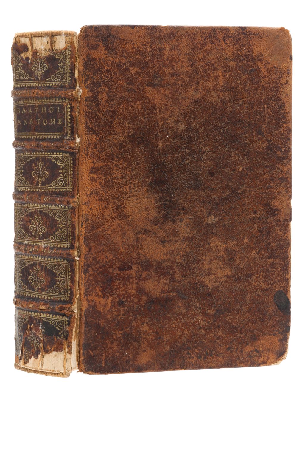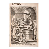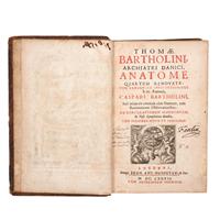 ME - Bartholin, Thomas. Archiatri Danici, Anatome Quartum Renovata. Lugduni: Sumpt. Marci & Joan.Henrici Huguetan, 1677. 8o. marquilla, 14 h. + 804 p. + 9 h. Frontispicio, retrato de autor y láminas (12 plegadas y algunas rasgadas). Pastas gastadas, lomo con faltantes en parte superior e inferior, cajos quebrados. Texto con manchas de óxido y página 187 rasgada. Encuadernado en pasta dura, en piel. Comprensivo manual de anatomía, que incluye descripciones del bajo vientre, la cavidad media, la cavidad superior, las venas, arterias, nervios y huesos del cuerpo humano. Thomas Bartholin (1616-1680), es reconocido sobre todo por haber descubierto el sistema linfático. Estimado $12,000-16,000