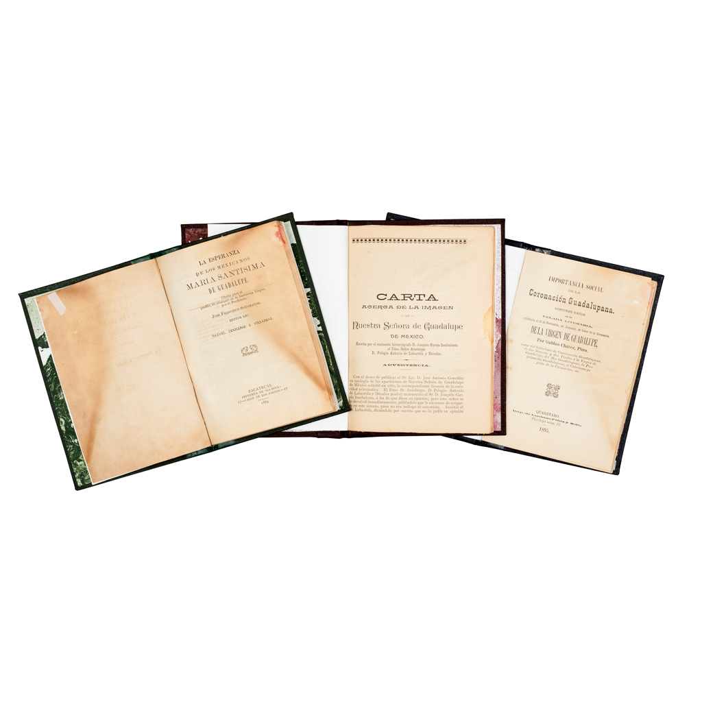 R - Sotomayor, José Francisco / Chávez, Gabino / García Icazbalceta, Joaquín La Esperanza de los Mexicanos, María Santísima de Guadalupe / Importancia Social de la Coronación Guadalupana / Carta acerca de la Imagen de Nuestra Señora de Guadalupe de México. a) Sotomayor, José Francisco. La Esperanza de los Mexicanos, María Santísima de Guadalupe. 8o. marquilla, 69 p. Texto con mancha de humedad. Encuadernado en pasta dura, lomo en piel. Obra que busca incentivar la devoción a la Virgen de Guadalupe como una forma de remediar todos los males que aquejan a la patria, mezclando de esta manera el Nacionalismo Mexicano con el culto Guadalupano. b) Chávez, Gabino. Importancia Social de la Coronación Guadalupana. Querétaro: Imp. de Luciano Frías y Soto, 1895. 8o. marquilla, 34 p. Discurso Leído en la Velada Literaria celebrada el 12 de Noviembre, en Irapuato, en honor a la coronación de la Virgen de Guadalupe. Texto con mancha de humedad, portada y última hoja con faltantes restaurados y rasgaduras. Encuadernado en pasta dura. c) García Icazbalceta, Joaquín Carta acerca de la Imagen de Nuestra Señora de Guadalupe de México. México: 1896. 8o. marquilla, 40 p. Texto con pequeña mancha de humedad en el margen derecho. Encuadernado en pasta dura, lomo en piel. Se trata de la célebre carta que el historiador Joaquín García Icazbalceta dirigió al Arzobispo Pelagio Antonio de Labastida y Dávalos, en relación a la aparición de la Vírgen de Guadalupe. Hoy en día se conoce a dicho escrito como "La Carta Antiaparicionista". Estimado $6,000-8,000