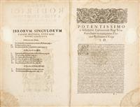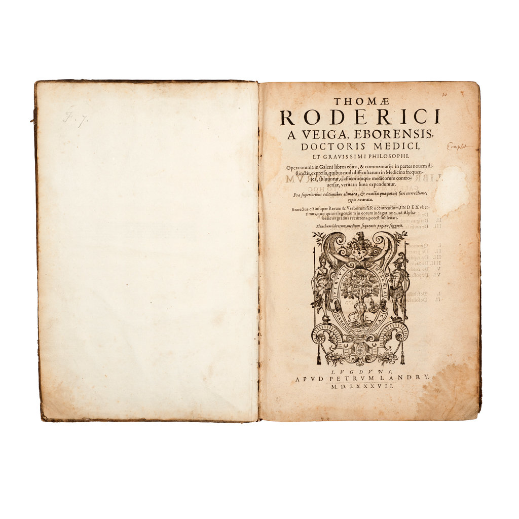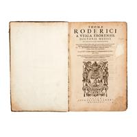 ME - Thomae Roderici a Veiga. Opera omnia in Galeni libros edita, & commentarijs in partes nouem distinctis, expreffa, quibus nodi difficultatum in Medicina frequentes, foluuntur, clafficorúmque medicorum controuerfiae, veritatis lima expenduntur. Lyon: Apud Petrum Landry, 1587. fo. marquilla, 3 h. + 500 p. + 20 h. Portada con viñeta xilográfica. Pasta anterior con puntos de polilla y gastada al igual que el lomo, sin cofia ni pie, cajo anterior quebrado, manchas de humedad en punta inferior derecha y margen inferior de algunas páginas. Encuadernado en pergamino. Tomas Rodrigues da Veiga (1513-1579), fue un doctor portugués de ascendencia española. Fue profesor de medicina en la Universidad de Coimbra y alcanzo el honorable puesto de médico personal del rey Joan III de Portugal, convirtiéndose en uno de los doctores mejor pagados de su tiempo. Convertido al cristianismo, fue nombrado Caballero de la Orden de Santiago. A lo largo de su carrera, Veiga vinculó su práctica como doctor con su trabajo como profesor en la Universidad. Dejo un gran legado bibliográfico, siendo su principal interés el estudio de Galeno; alcanzando su obra maestra en su libro "As Opera omnia in Galeni libros edita et commentariis in partes novem distintis", que aunque ya era estudiado en su universidad en Coimbra, fue publicado póstumamente hasta 1587. Su gran admiración y respeto por la medicina clásica griega es notoria. Veiga traducía del griego y complementaba el componente clásico con las innovadoras practicas renacentista, citando a los doctores contemporáneos; entre ellos al fundador de la anatomía moderna Andreas Vesalius y Jean François Fernel, quien acuño los términos de fisiología y patología. Obra médica renacentista, seleccionada como una de las "Joyas de la Biblioteca Nacional de Medicina de España". Estimado $20,000-25,000