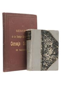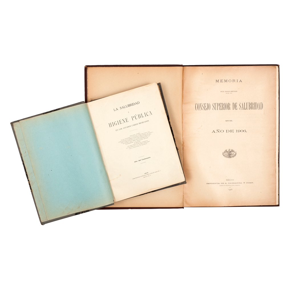 ME - Secretaría de Gobernación / Liceaga, Eduardo. La Salubridad é Higiene Pública en los Estados Unidos Mexicanos / Memoria de los Trabajos Ejecutados por El Consejo Superior de Salubridad en el año de 1906. a) Secretaría de Gobernación. La Salubridad é Higiene Pública en los Estados Unidos Mexicanos. México: Casa Metodista de Publicaciones, 1910. 4o., CLXIV + 532 p. Con tablas plegadas. Brevísima Reseña de los preocesos alcanzados desde 1810 hasta 1910, publicada por el Consejo Superior de Salubridad. de México. Pastas, lomo y pie gastados, cofia con faltante. Encuadernado en pasta dura. b) Liceaga, Eduardo. Memoria de los Trabajos Ejecutados por El Consejo Superior de Salubridad en el año de 1906. México: Imprenta de A. Carranza y Comp., 1906. 4o. marquilla, 187 p. Con tablas plegadas. Pastas, lomo, cofia, pie y puntas gastadas. Encuadernado en pasta dura. Memoria presentada por Eduardo Liceaga, entonces Presidente del Consejo Superior de Salubridad. Liceaga, es reconocido por la construcción del Hospital General de la Ciudad de México en 1905 y por la proyección de lo que ahora se conoce como la Colonia Doctores. Además, ocupó los cargos de Presidente del Congreso Médico Nacional de Higiene y Director de la Escuela Nacional de Medicina, entre otros. Total de Piezas: 2. Estimado $7,000-9,000