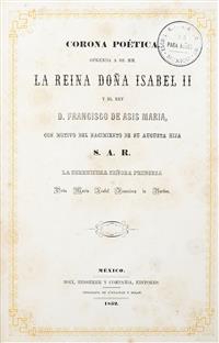 L - Los Españoles Residentes en América. Corona Poética. México: Boix, Besserer y Compañía, 1852. 4o. marquilla, 90 p. + 1 h. Ofrenda a SS. MM. la reina Doña Isabel II y el rey D. Francisco de Asís María, con motivo del nacimiento de su augusta hija S. A. R. la serenísima señora princesa Doña María Isabel Francisca de Borbón. Con 32 litografías de Salazar, una plegada (Retratos, escudo de armas de España y un cuadro genealógico de diez y seis costados de S.M. la Reina Doña Isabel II). Textos de Pascual Riesgo, Vicente María Riesgo, León Carbonero y Sol, Angela Grassi, José Amador de los Ríos, Francisco Martínez de la Rosa, Juan Eugenio Hartzenbuch, Emilio Rey, Juan Manuel Álvarez, Dolores Guerrero, Antonio Flores, Manuel Azcutia, Niceto de Zamacois, Vicente Irolo, entre otros. Pastas y lomo gastados. Texto y láminas con manchas de óxido; primeras páginas y láminas con mancha de húmedad en margen inferior; sin frontispicio; lámina plegada, rasgada y restaurada. Encuadernado en pasta dura, lomo en piel. Estimado $7,000-9,000