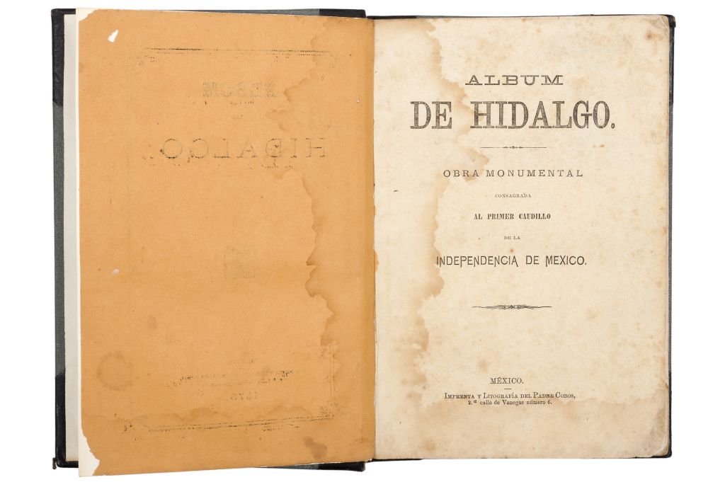 HM - Paz, Irineo (Introducción). Álbum de Hidalgo. México: Imprenta y Litografía del Padre Cobos, 1875. 8o. marquilla, 270 p. + 1 h. Obra monumental consagrada al primer caudillo de la Independencia de México. Con 4 láminas (litografías de los retratos de Hidalgo, Juárez y Maximiliano y vista de la Casa de Hidalgo en Dolores). Con mancha de humedad en pasta original anterior, portada, primeras 8 páginas y láminas. Con sello "Propiedad de la Biblioteca de María Félix". Conserva pastas originales, en rústica. Encuadernado en pasta dura, lomo en piel. Palau: 5471. Estimado $4,000-5,000