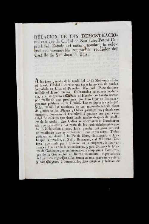 DP - Relación de las demostraciones con que la Ciudad de San Luis Potosí Capital del Estado del mismo nombre, ha celebrado el memorable suceso de la rendición del Castillo de san Juan de Ulúa. En el Armadillo, Imprenta de Alexo Infante, sin año. 8o. marquilla, 5 hojas. Estimado $3,000-4,000