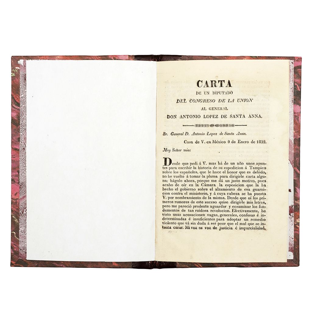 DI - Carta de un Diputado del Congreso de La Nación al General Don Antonio López de Santa Anna. "… Desde que pedi a V. mas ha de un año unos apuntes para escribir la historia de su espedición a Tampico sobre los españoles, que le hace el honor que es debido, no he vuelto a tomar la pluma para dirigirle carta alguna; hágolo ahora, porque me dá un justo motivo, pues acabo de oir en la Cámara la esposicion que la ha hecho el gobierno sobre el alzamiento de esa guarnición contra el ministerio, y a cuya cabeza se ha puesto V. por nombramiento de la misma…". México: Oficina del C. Dionisio Rodríguez, 1832. 4o. marquilla, 12 p. Encuadernado en pasta dura. Estimado $5,000-6,000