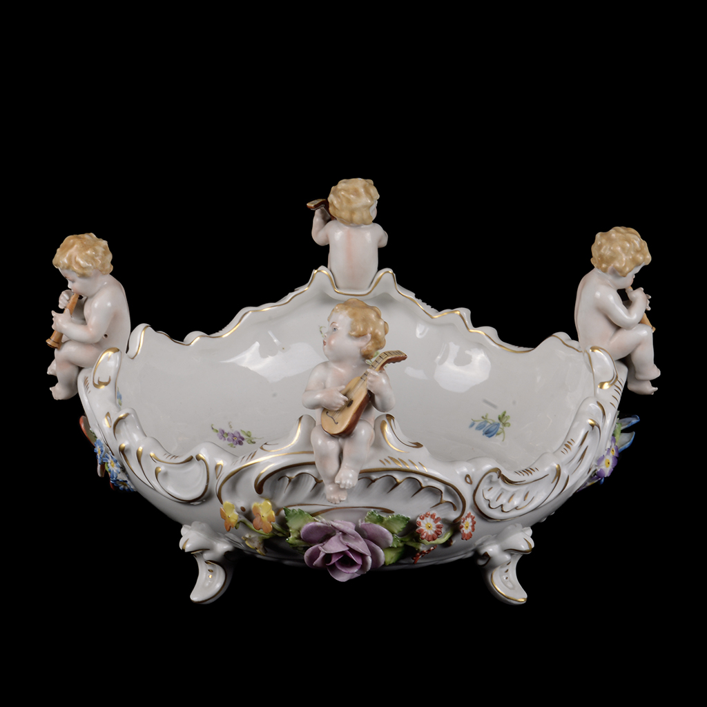 Centro de mesa. Alemania. Siglo XX. Elaborado en porcelana Von Schierholz. Con esmalte dorado. Decorado con niños músicos y motivos florales. Presenta detalles de conservación y faltantes. Dimensiones: 16 x 30 x 30 cm. Estimado $4,000-6,000